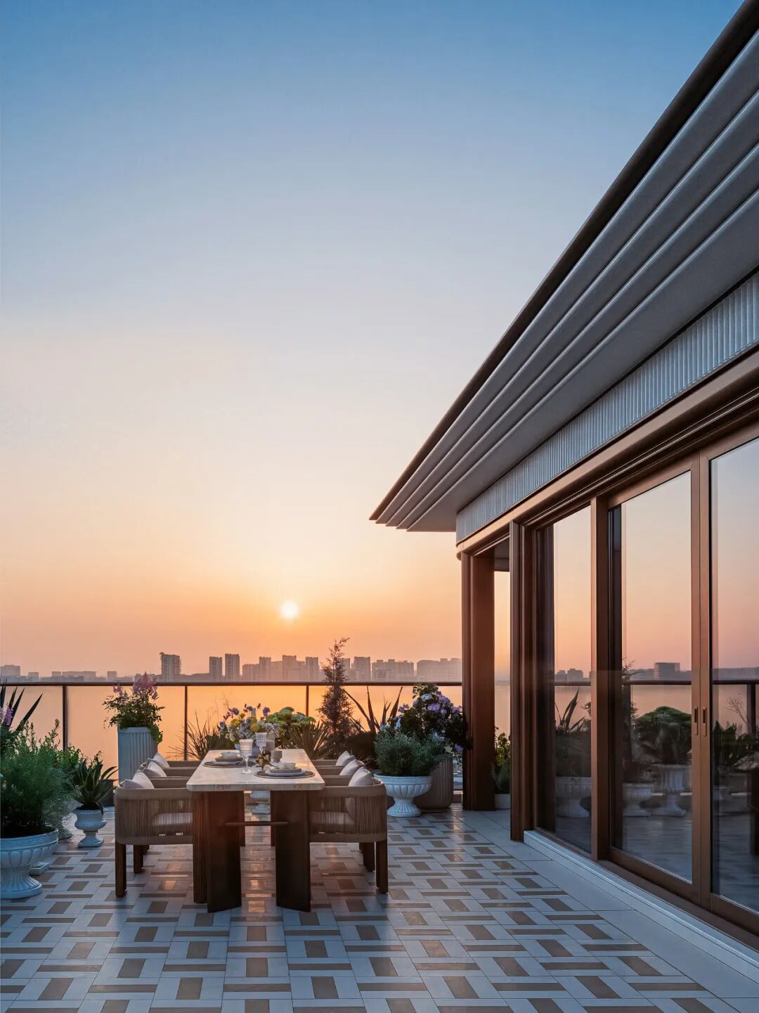 露台约66方,足以种满四季的花,也足够摆下长桌宴请知己。清晨,熹微的阳光洒进杯沿;黄昏,晚霞把运河染成鎏金。不必刻意做什么,一张躺椅,一本书,或者只是闭着眼感受风,日子便慢了下来。