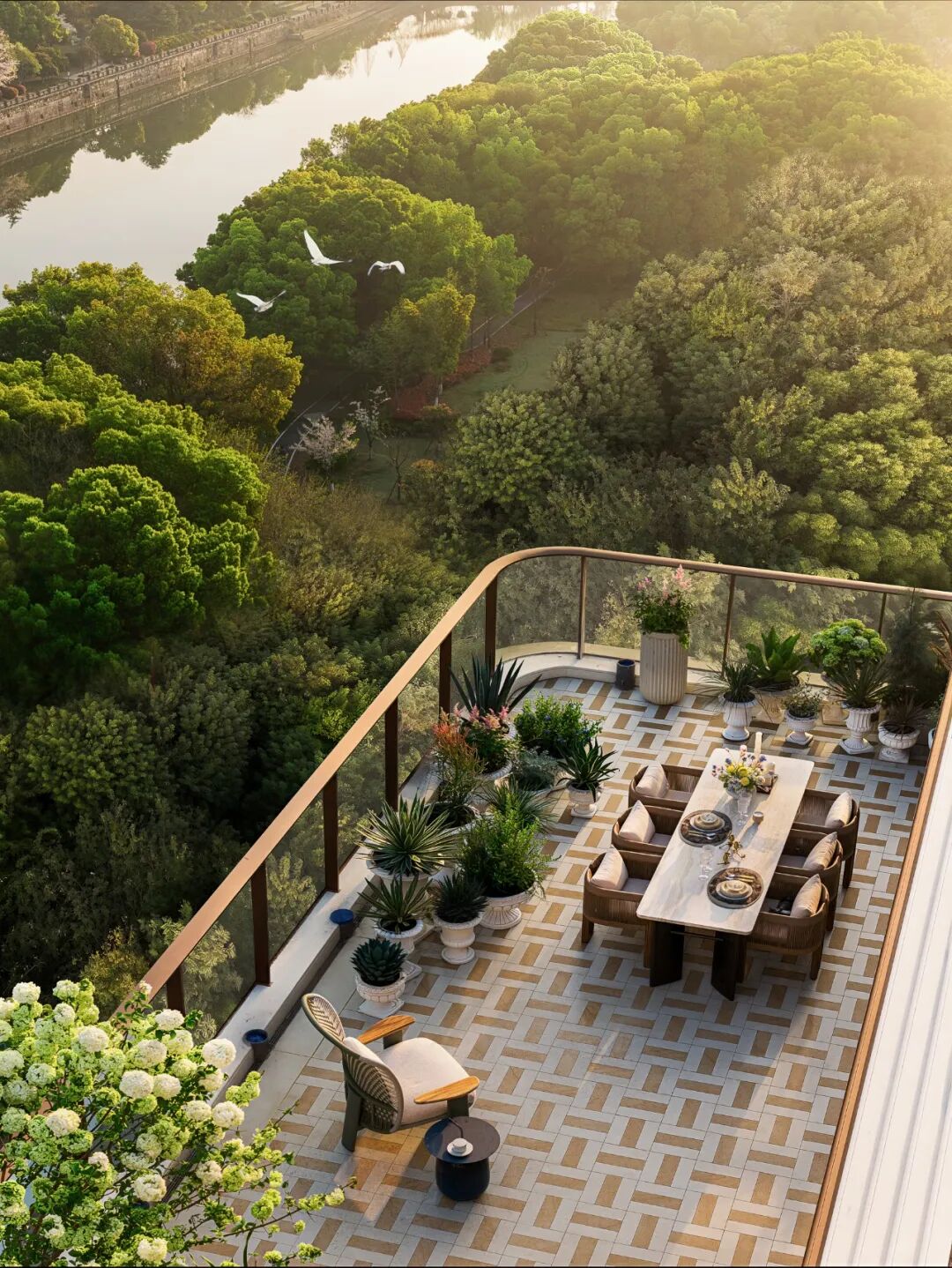 露台约66方,足以种满四季的花,也足够摆下长桌宴请知己。清晨,熹微的阳光洒进杯沿;黄昏,晚霞把运河染成鎏金。不必刻意做什么,一张躺椅,一本书,或者只是闭着眼感受风,日子便慢了下来。