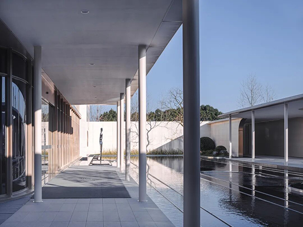 Along the corridor, the stone walls flow light, the mirror pond reflects, the corridor frame and the wall surround the quiet water courtyard, forming the Liuying water courtyard with "purity and art" as the main theme around the building.