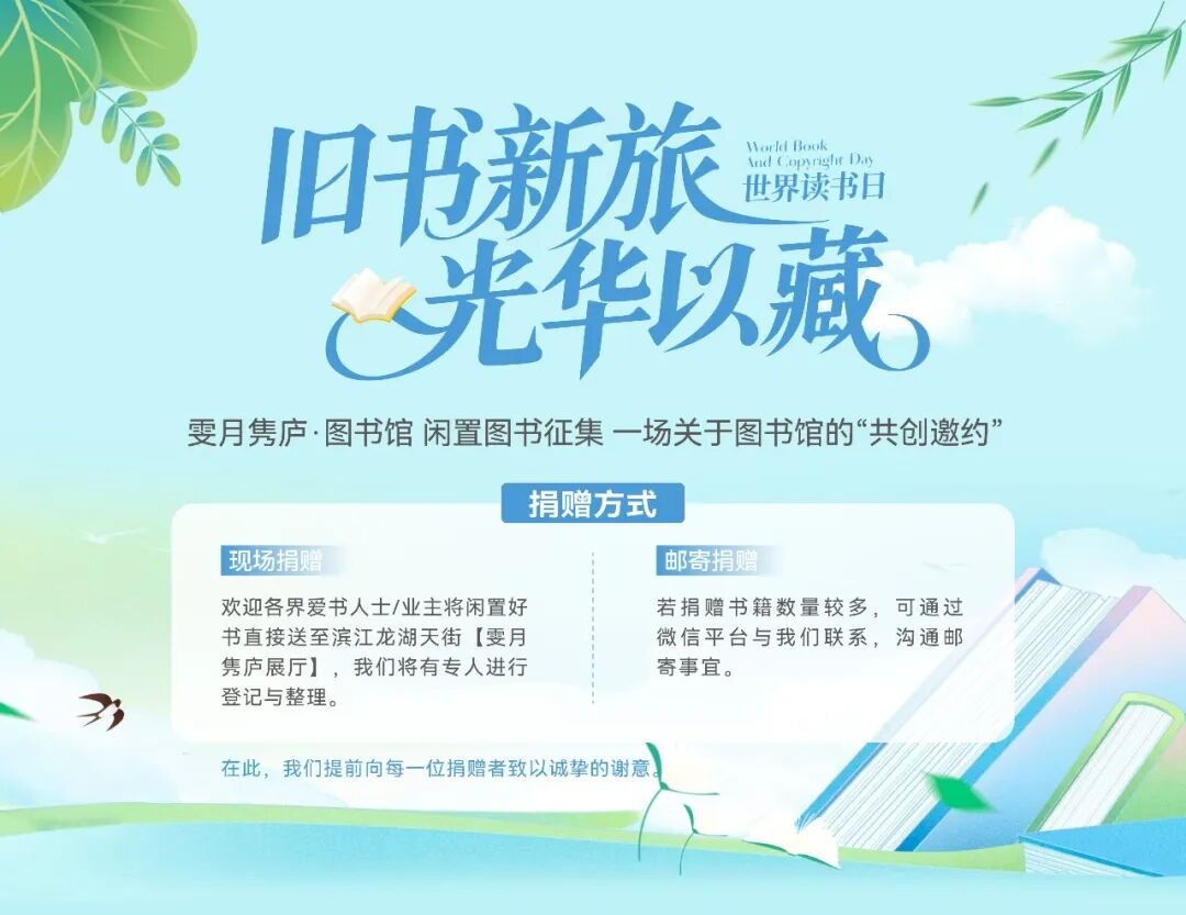 此外,我们将同步向大家社区业主发起图书征集,诚挚邀请业主把闲置图书带至雯月隽庐展厅,共赴书籍的漫游之旅。